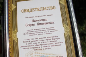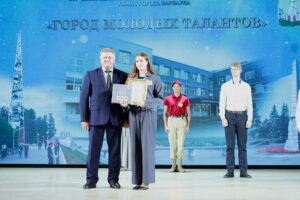 Торжественная церемония вручения именных выплат главы города «Город молодых талантов» состоялась на сцене концертного зала Алтайского государственного института культуры. Свидетельство об именной выплате главы города в 2025 обучающаяся Центра развития творчества детей и юношества Ленинского района получили из рук Андрея Генриховича Муля, председателя комитета по образованию города Барнаула.