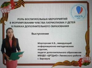 Моргорская Наталья Владимировна, заведующий информационно-методическим отделом и педагог дополнительного образования волонтерского отряда СДПО «Юность», выступила на XХII международной научно-методической конференции «Теория, история и практика образования в сфере культуры». Организаторам конференции стал Алтайский краевой институт культуры. Темой доклада Натальи Владимировны была «Роль воспитательных мероприятий в формировании у детей чувства патриотизма у детей в рамках дополнительного образования».