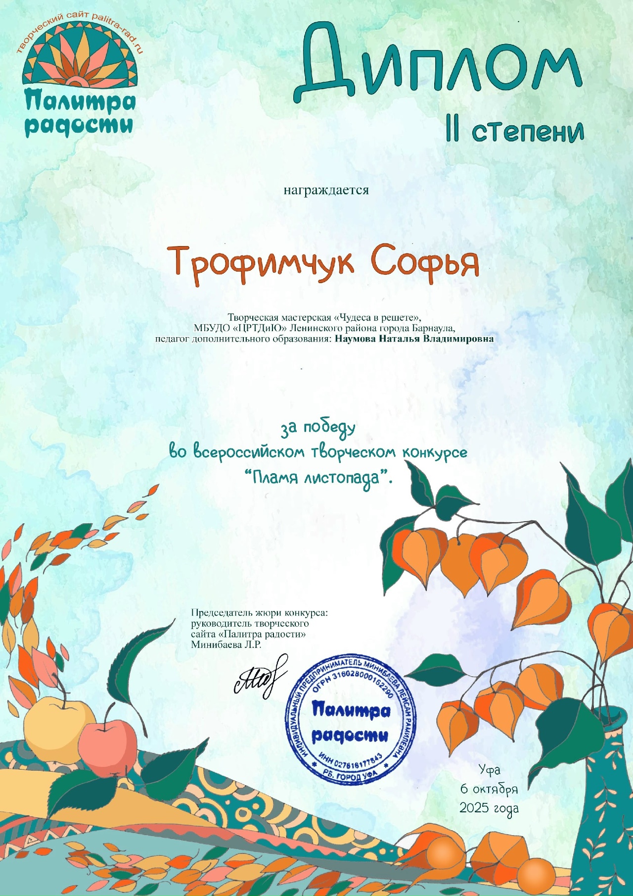Дипломом II степени всероссийского творческого конкурса «Пламя листопада» награждена Софья Трофимчук.