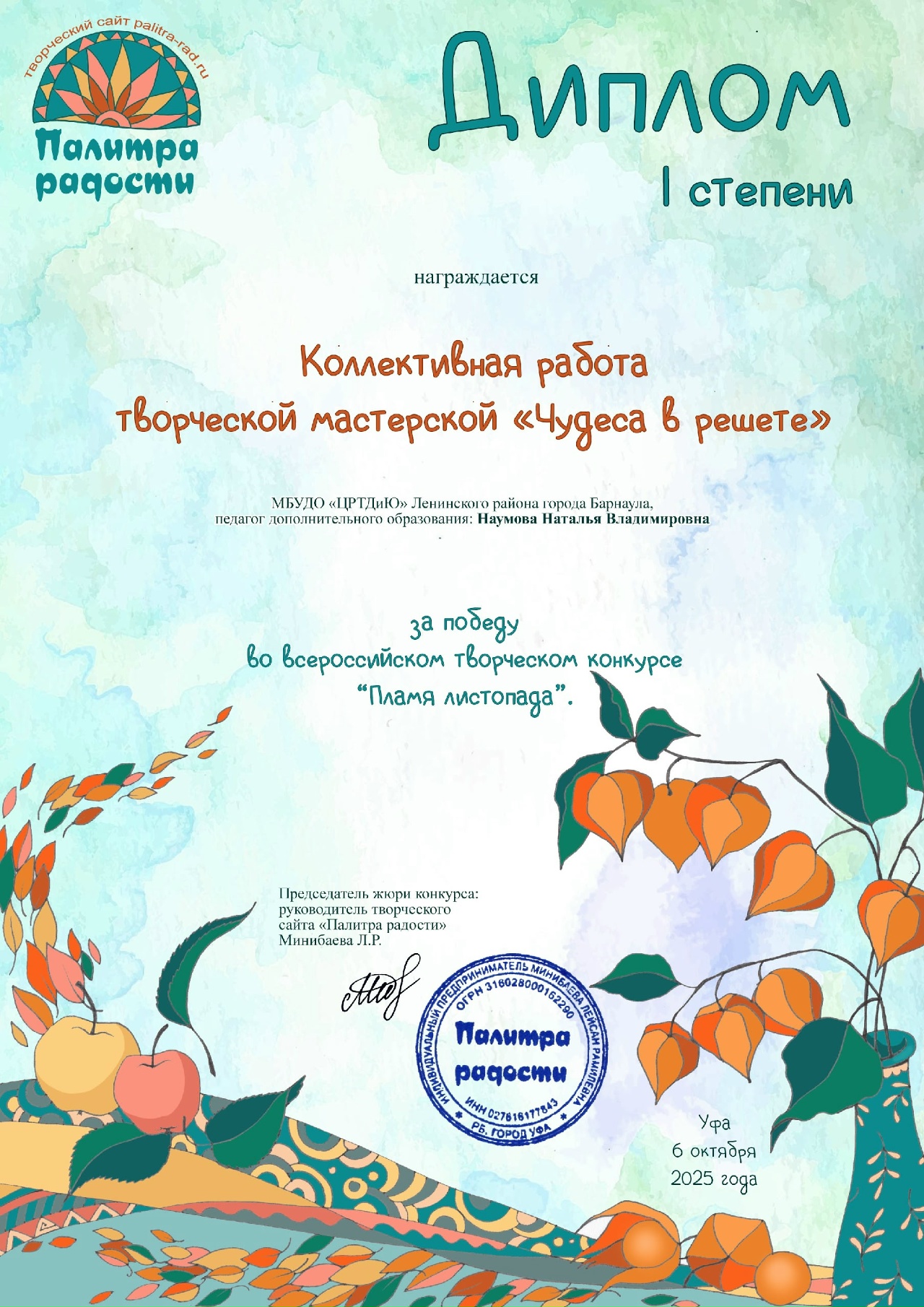 Коллективная работа обучающихся творческой мастерской «Чудеса в решете» (педагог – Наталья Владимировна Наумова) награждён дипломом I степени всероссийского творческого конкурса «Пламя листопада».